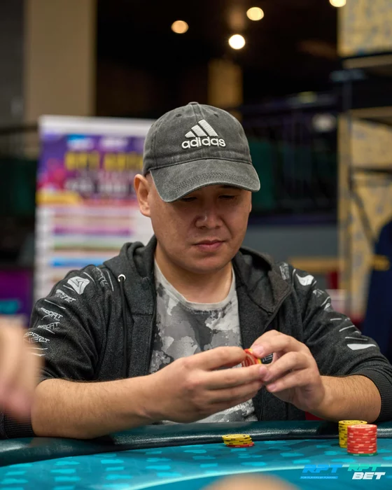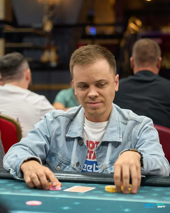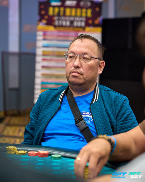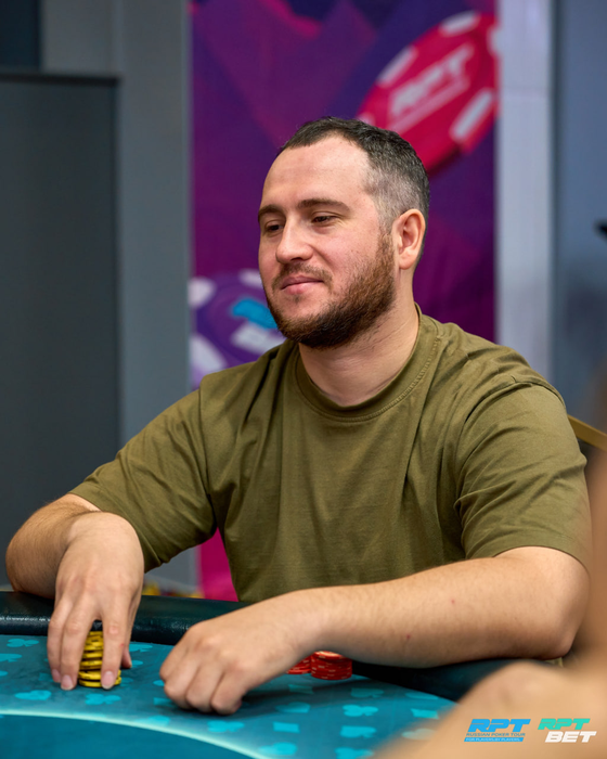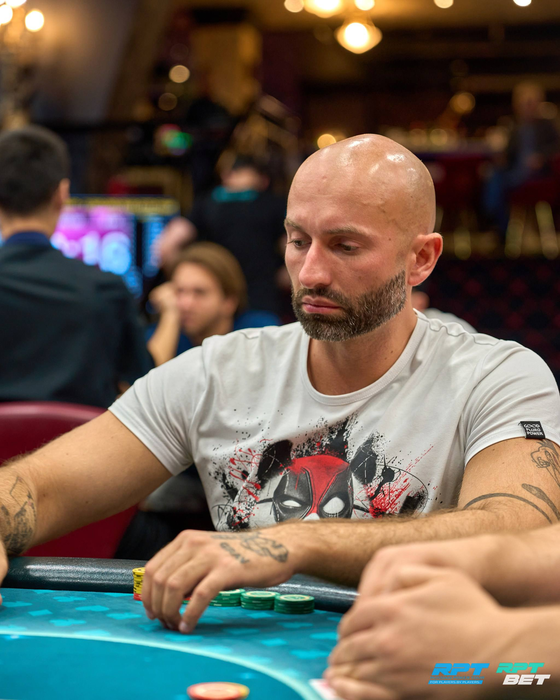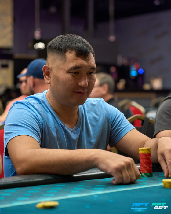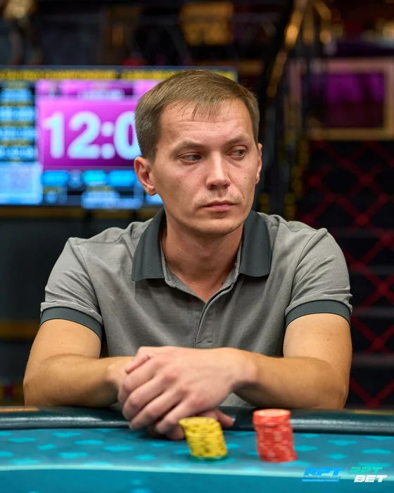 Владимир Аладьев задвинул 260К с малого блайнда. На оставшиеся ~55К поехал Мерген Бугуев с большого блайнда.