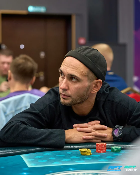 Владимир Аладьев (~105К) поставил недопуш с первой. На ВВ Александр Воропаев (390К) отсыпал фишек «на глаз», покрывая.