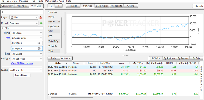 Отыграл 150к раздач, уже больше нравится как играю, меньше необдуманных действий, диапазоны четко веду во время игры, стараюсь автоблефы не пропускать и подбирать все споты которые плохо лежат) Не все конечно идеально, есть куда расти, буду стараться.