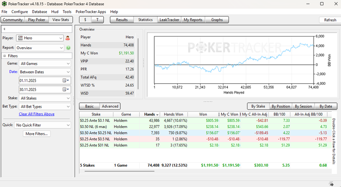 За ноябрь откатал 75к рук суммарно. Мог отыграть 80, даже 90к, но последняя неделя подкачала. Приехали друзья на неделю, остановились у нас в квартире + когда ходили в баню траванулся, в итоге день просто лежал не мог разогнуться, только во второй половине дня стало полегче.