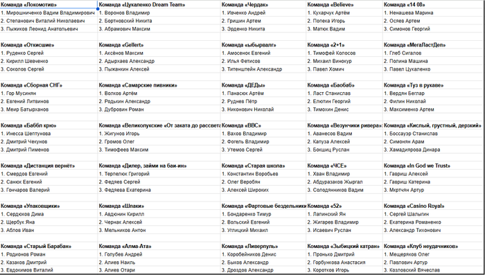 Быстренько сверстал для вас небольшую табличку из всех команд, которые заявились в рамках Командного рейтинга, чтобы вы не копались в ветке и знали своих соперников в лицо)