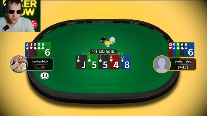 Кайхан открылся, aloha поставил 3-бет $3,600 и заколлировал 4-бет $10,800. На постфлопе aloha поставил три барреля – $3,600, $7,600 и олл-ин $22,760. Кайхан все улицы играл коллом.