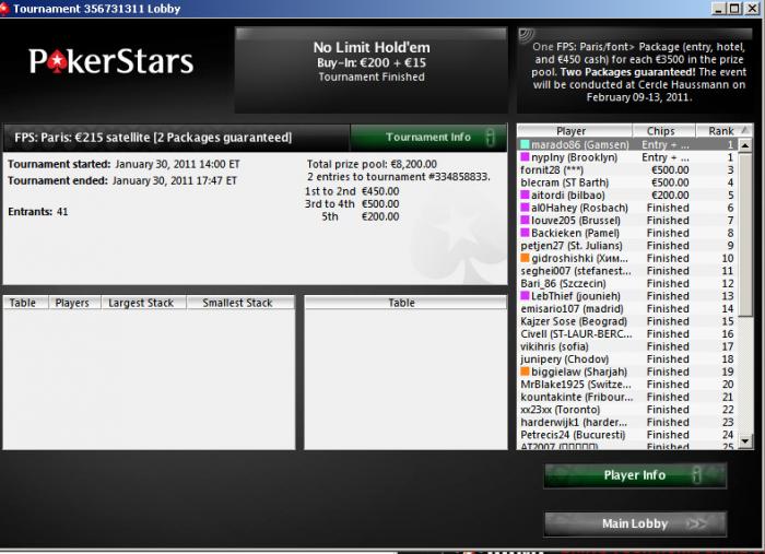 сыграл сегодня 2 фтопса 1) 7-игр за 322, занял 29 место (с одной стороны доволен местом - если смотреть до начала турнира, с другой стороны финалка была очень близка, в результате ошибочно выставился с коротким стеком) 2) супертурбо за 216, занял 113 место (мог не попасть в призы, а мог и дойти до финального стола, сперва выиграл два раза AQ>AK, а потом практически в банке за стек, который выводил в ТОП-5 не устоял с АА<KK)