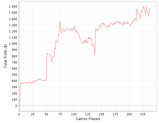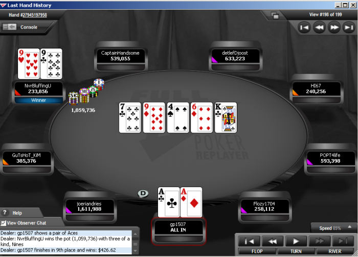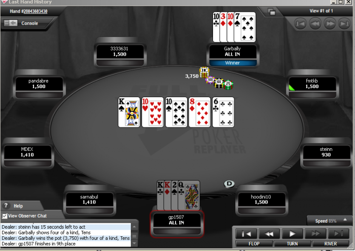 другой турнир - гипертурбо сателит к FTOPS HA - до финального стола выигрывал 70-80 % сравнений, в том числе снизу. Вышел на финальный стол громадный чиплидером - 3000 против 700-800 у второго-третьего. Потом проигрыш в PLO с АА** на доске А72 руке AQJT, терн - J, ривер - К. Итог - второе место.