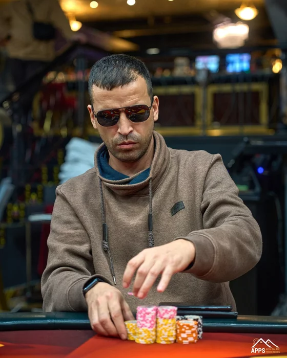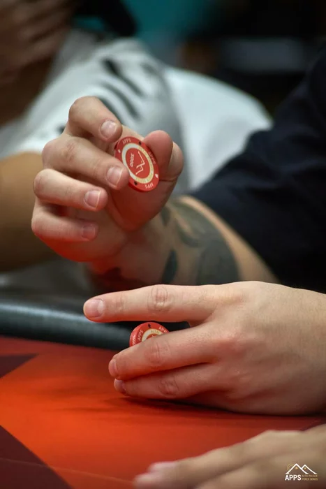 Доска . Ринат вновь улучшает положение своего стэка, а Дмитрий покидает стол.