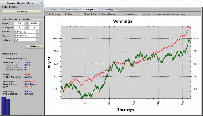 Резкое падение ЕВ линии последние 20 турниров, это не тильт, а постоянное попадание в натсы. Но я это на удивление спокойно воспринял и даже не стал отыгрывать мою ежедневную планку в 150 турниров. 3 матча сыграл с Narkotiks, был удивлен увидеть его на 60ках. Был не против сыграть с ним побольше, дабы получить недорогие уроки игры от одного из топрегов ФТП, но у него похоже автоотказ стоял.