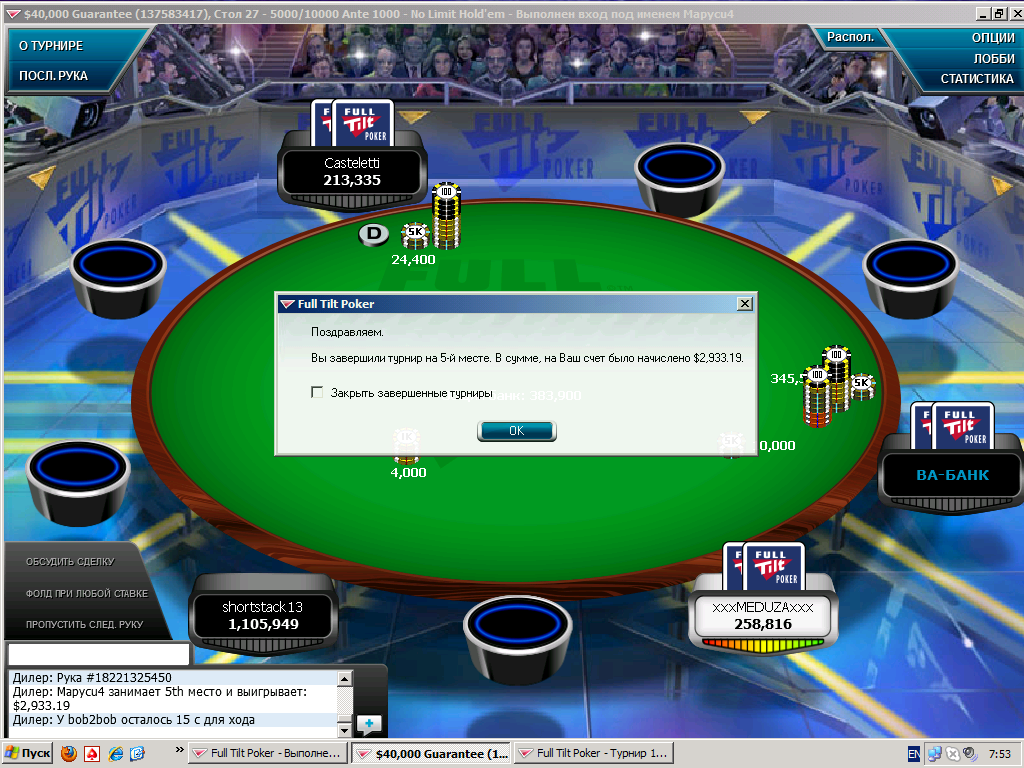всем привет , только что отыграл тот-же КО за 5 долларов , где пару дней назад занял 1 место , сейчас поделили в HU сразу даже не стали играть , финалка была очень сильная и сложная.. , 3 раза переезжали тремя outami , один раз я переехал AJ > AQ было бы не справедливо , еслиб этого не случилось... играли больше 5 часов , сил нету...