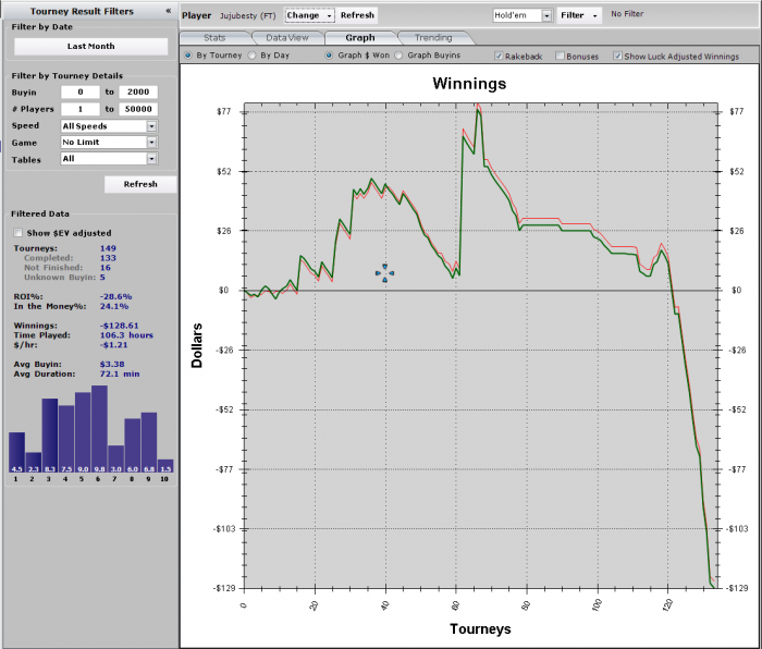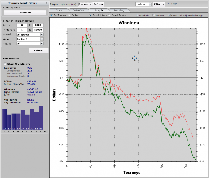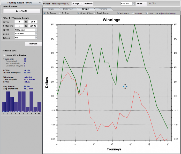 еще один день... безрезультатно(( осталось 12 дней, сыграно 190 турниров... сегодня первый раз попал за финалку такого "смешного" турнира на фтп - называется это чудо кешаут турнир.... когда осталось 10 человек, то исходя из размера своего стека я мог забрать из фонда кешаута около 10 баксов, но не стал этого делать, наивно полагая, что весь призовой пул кешаута перейдет к финалистам... но на финалке пул (~$118!!!) обнулился((( в итоге занял 6-е место и +13$ а мог еще 10$ забрать((( наука мне на будущее... с утра шел примерно +$20-25, но к вечеру румы просто кишат неадекватами... а префлоп выставления - это не мой конек.. увы.....