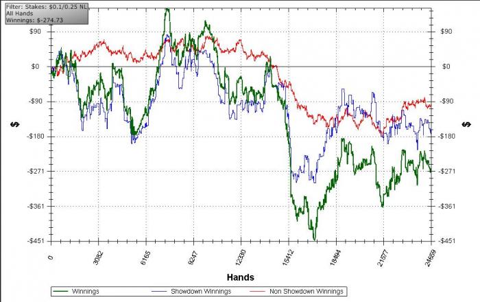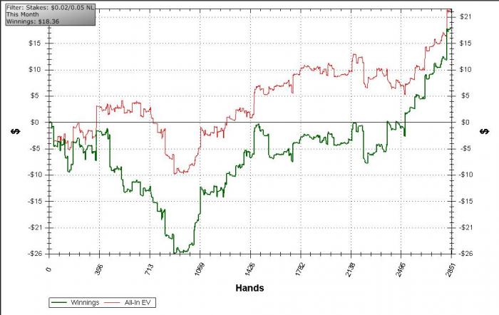 До конца месяца еще неделя, но, думаю, сейчас уже можно подытожить период март - апрель 2011. Играл в подавляющем большинстве NL25. Не могу сказать, что доволен результатами, но этот период оказался безусловно полезным как начальный опыт кеш-игры.