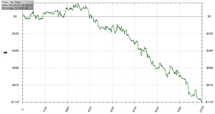 Сейчас введу стоплосс по правилу 321. Если сессия уходит в -3БИ, стоп, перерыв. Дальше, если -2БИ, стоп, перерыв. И -1БИ стоп, сегодня больше не играем. Банкролл просел существенно, так что спускаюсь на NL25 6макс.