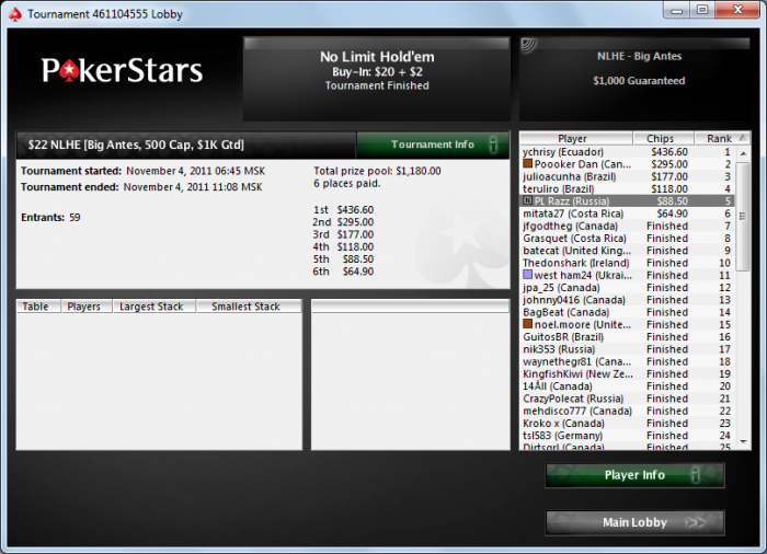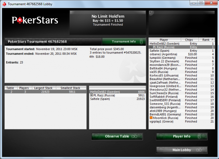 Че-то я быстро закончил, учитывая, что закончил регаться всего два часа назад.. несмотря на 7 часов реги отыграл всего 13 турниров за сегодня, из-за кикоффа, так как старался с ним не играть параллельно много столов.. ну а после вылета из него уже маловато туриков осталось хороших. Итог 3 итма.. в последнем итме в биггере по 22 проиграл обидный большой банк 78к на уровне 400-800 с против выставились на терне и ривером упала пика...