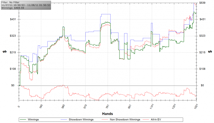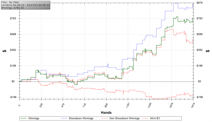 В общем, по месяцу картина довольно странная. Только благодаря вчерашнему дню я в плюсе. Потому что мне заходило как богу, а если заходило хуже чем оппам, то я их переезжал . В начале декабря очень плохо играл, наделал ошибок примерно на $600 за 8-10 тыс. рук. Сейчас настроился и стал играть получше.
