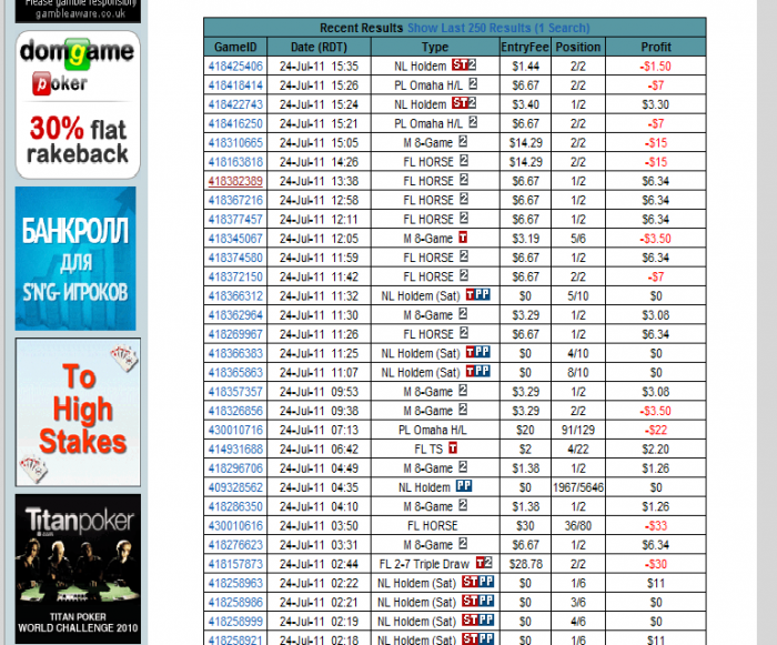 Теперь вопрос играет ТС только турниры или кеш игры. Как-то можно проверить статы по кеш играм за этот период, начиная с турнира по времени с 12.11 часов 24 июля 2011 года. с турнира... 457( виден по кэшеру БР на тот момент)
