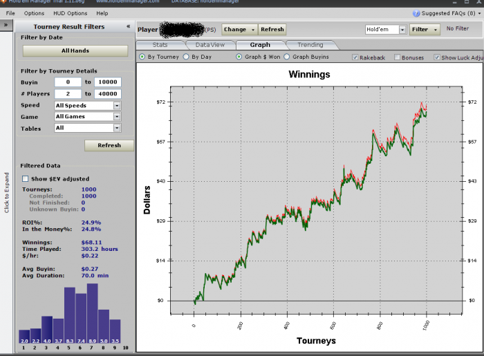 Отыграл 46 турниров в +3,23.... Первые 26 турниров отыграл как раз в этот +, а потом решил сыграть ещё 20 турниров , т.к хотел добить количество турниров до 1000 ... играл стопкой 20 турниров и понял , что такое количество пока не оч комфортно играть , но в будущем в полне реально ... под конец сделал пару оч серьёзных ошибок ... делаю вывод , что нельзя ни на секунду расслаблять .... но в принципе 15 сразу вполне под силу играть ... так , что если буду играть теперь сесси по 15 туриков, то в день будет получаться по 45 ... в принципе реально ... хочу разобраться с программкой тейбл нинзя ... если , кто видел какой - нить видос или инфу по этой программе прошу написать... ну и выкладываю обещенный график за 1000 турниров на этом лимите ....
