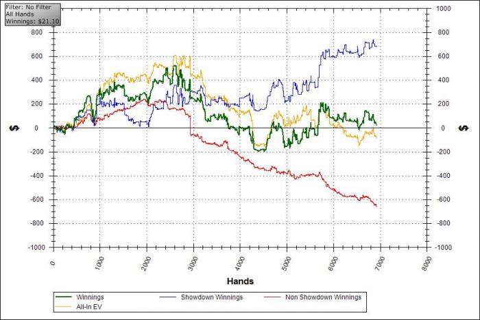 Потом с мая 2011 пошло всё дико хуёво, я стал очень часто выводить на жизнь и на институт. Одновременно меня настиг даунстрик, а у мтт сколько вы знаете даунстрики лютейшие. Но всё ещё было в рамках плюс-минус 1.5к. Потом я решил сделать месячный перерыв на время сессии в инсте, фтп рухнул, я потерял ещё 1к. В итоге к Июлю у меня было около 5.5к. Я показывал хороший покер, я в этом асболютно уверен, но выиграть никак не удавалось, так уж госпожа удача решила. И вот настаёт тот момент, когда у меня 3к на счету. Для меня тогда это уже удар был. Я решил играть с АБИ 10$, это 300 БИ, если учесть что я уже дважды с 1к поднимался на АБИ 10$, т.е со 100 БИ. Я твёрдо знал, тут я уже не проиграю. Играя с дикими фишами на небольших полях, я всё равно падал вниз. Я разбирал игру, играл много и т.д. Но вот я уже здесь с этими копейками ввиде 1600$.