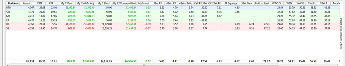 Hero (UTG+1): 21.93 BBMP: 14.82 BB (VPIP: 40.51, PFR: 38.16, 3Bet Preflop: 17.24, Hands: 81)