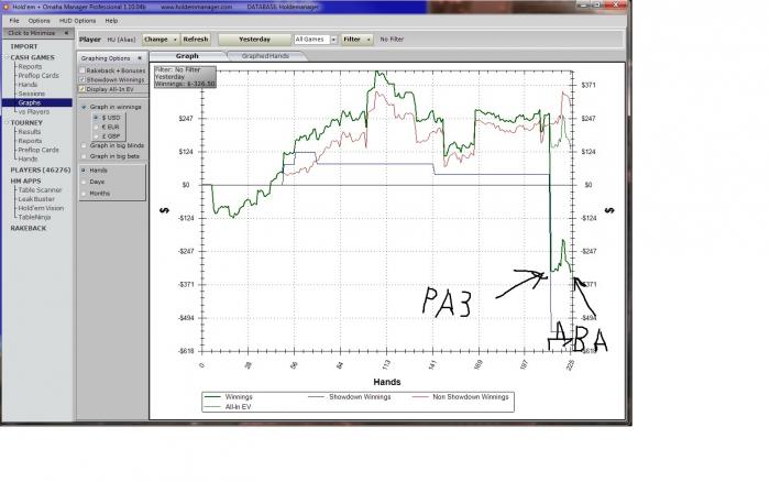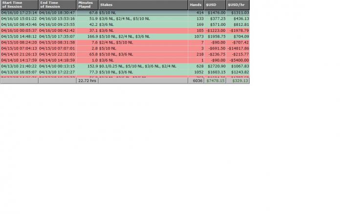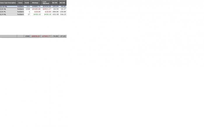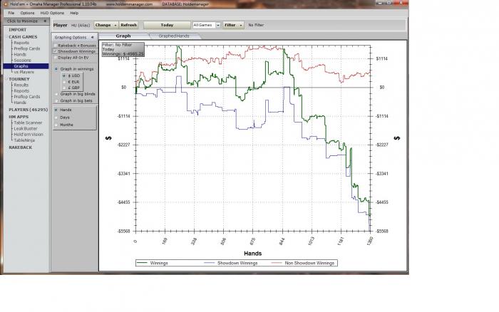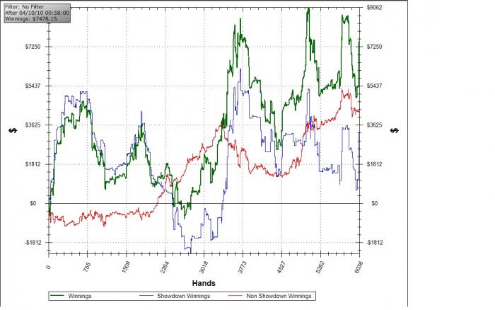 Подведем недельные итоги. Завтра я уезжаю на свадьбу и играть не буду. В принципе недельный результат должен меня устраивать, но у меня остался неприятный осадок. Я получил дикое количество кулеров и подстав в очень плюсовых для себя ситуациях. Напрмиер, у соперника 4бет 30%-35%, у меня ТТ, я ставлю аллин и попадаю в JJ, если у меня JJ, то у соперника KK. Я считаю, что мне очень не везло в этом, но я перебал по аллин ев, поэтому мой часовой результат не пострадал, но это только за эту неделю. Если считать этот месяц, то все не так сладко, т.к. в начале месяце у меня был дикий недобор. Также за эту неделю hit and runner'ы меня просто достали, за два предыдущих дня мне попался только один не hit and runner, поэтому весь мой профит с игры против регуляров.