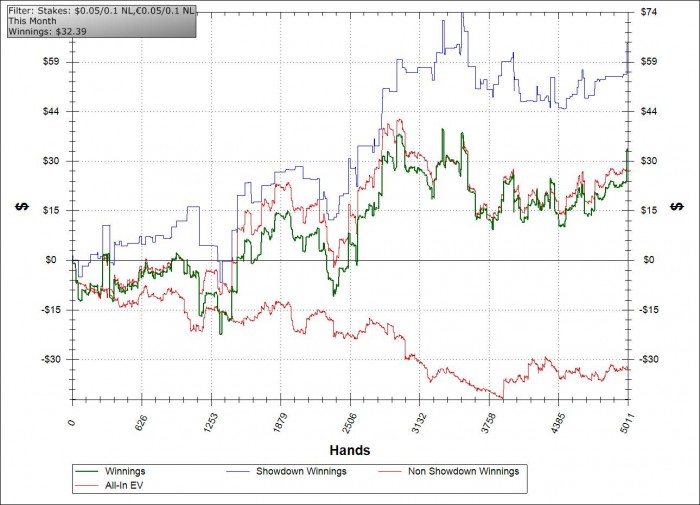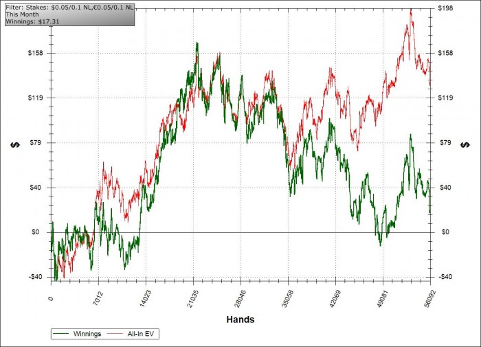 Месяц получился в 0. Сыграно 56092 руки по профиту +17$, еще + 100$ - это бонусы фпп и впп. По ev + 130$, но это всего лишь ev. Я ужасно недоволен, моя игра оставляет желать лучшего, так еще и по ев недобор 13 стеков. Но я ныть не собираюсь, а настроен на очень серьезный анализ своих статов и игры в целом. На выходных повозиться с базой возможности не было, играл на получение статуса GoldStar, поэтому в ближайшие два дня играть не буду, а займусь разбором своей игры и поиском ликов, а их у меня очень много. Но цель, поставленная вначале блога была все таки выполнена.