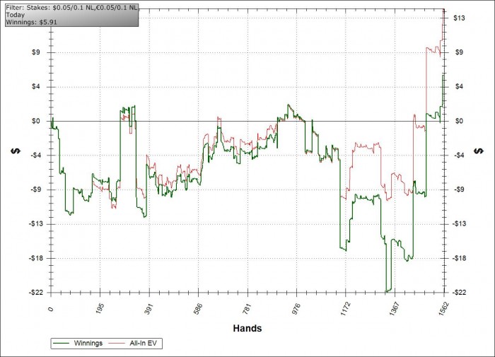 Сегодняшняя сессия выдалась не легкой, опять, по старой традиции вначале сессии я ушел в минус, пора бы наверно дать себе установку первые 100 рук играть со статами 7\6 , затем я отбился вот так: