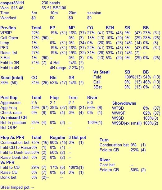 После этой раздачи снова пришлось отбиваться было выставление в в мою пользу и еще несколько мелких банков и сессию удалось вывести в +. Работал сегодня со статистикой, сейчас буду продолжать разбирать базу и руки. О результатах отпишусь позже.