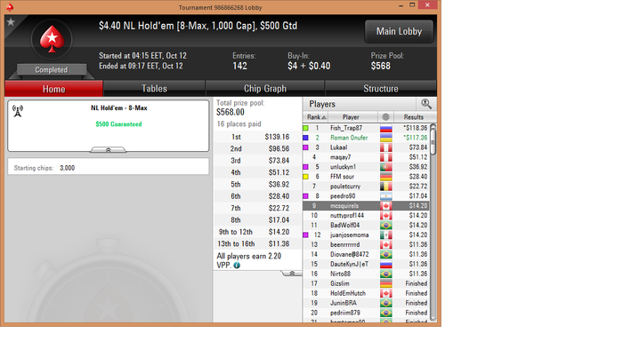 Наконец то сделал топ2 в 4,5 180макс. В хедз апе попался агро и соотношение фишек 1 к 3, плюс у меня еще 12 столов, так что без шансов. Еще было 29/600 в 5,5, там А10<А3 префлоп и 20/600 в 4,4, не помню как вылетел. Терпим и ждем. Всем удачи