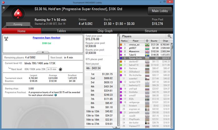 Poker Stars $4.10+$0.40 No Limit Hold'em Tournament - t50/t100 Blinds - 8 players