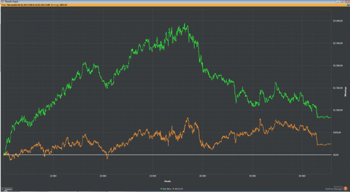 сделал я не просто так. Играл на нл100 просто отвратительно. Причину вижу в том, что находился в подвешенном состоянии из за запланированной поездки в тай. Скоро пора ехать, а я снова закатал половину банкролла. Мотивация сразу упала и в последней сессии я натильтовал на -10 би по ев, что является наихудшим результатом (по ев) за весь период игры с ноября. Теперь вопрос с деньгами на поездку решен. Гора с плеч. Вроде проиграл, а задачу выполнил График за январь.