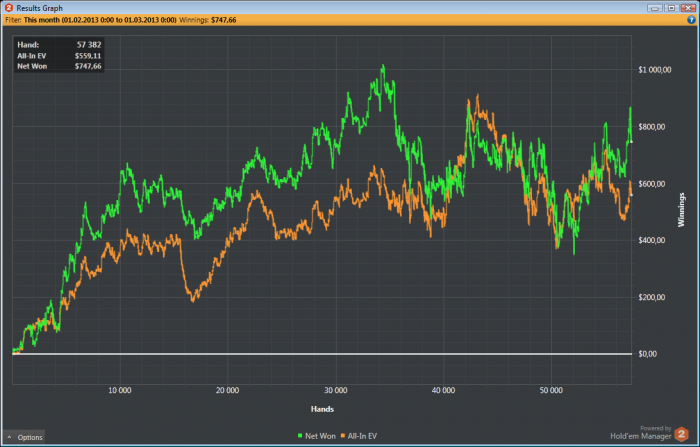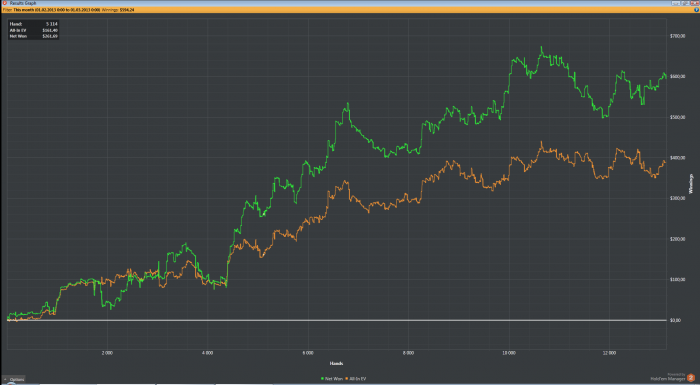 Вчера играл сотку. Есть плюс по ЕВ. Вроде нормально. СТОП! Для кого то может быть и нормально, а для меня - топ рега нл 100 - не очень. После нл 200 мотивация играть нл100 пропадает. Плюсую нам 2бб/100 и ладно. Цифры ведь зеленые. Усложняю себе задачу. Играть нл в 5бб/100 в регулярных составах без селекта. Для того, чтобы играть нл200 в регулярных составах, сотку я должен просто разрывать. Теперь результат за сессию меньше 100$ по ЕВ это не зеленая цифра а красная! (Было бы неплохо настроить это в ХМ). Результат за день должен быть 400$ по ев. У меня уже был день 700$ по ев. Можно сказать, что аповый день, но по настрою это был лучший день за время игры нл100. Я каждую сессию себе твердил под нос "соберись тряпка, покажи им как надо играть в покер!". Тогда у меня был даунсвинг, и каждый день мне недодавали долларов 300. Катушка в ноль просто сожрала бы мой банкролл, а спускаться на нл50 оооочень не хотелось. Апсвинг меня сильно расслабил. Я понимаю, что есть дисперсия и каждый день делать 400 не получится. Должны быть дни по 200. Но и по 600 тоже должны быть. А таких дней не было давно.