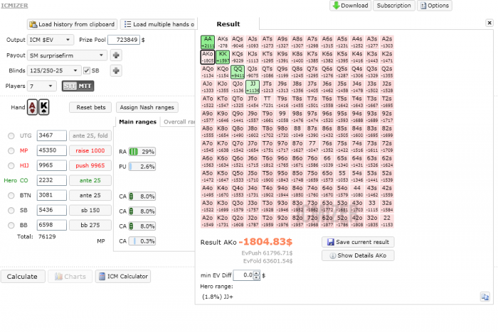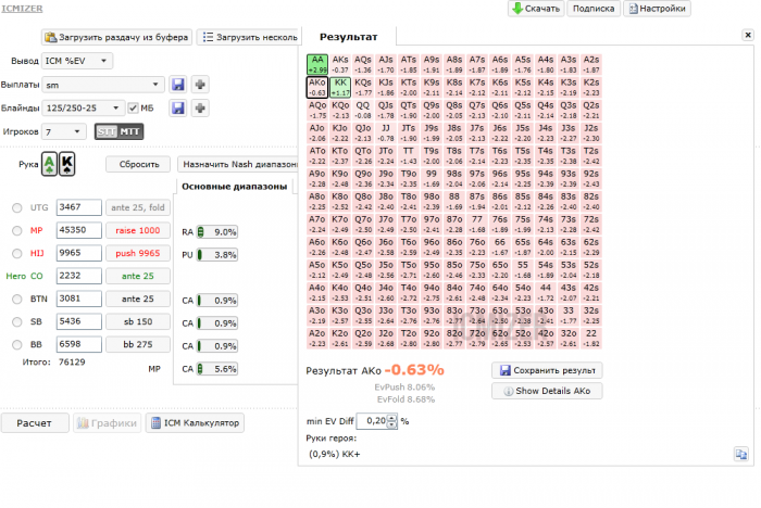 - первоначальный рейзер: 77+, ATs+, AJo+, KJs+, KQo. Закрывает пуш на 88+, AQ+