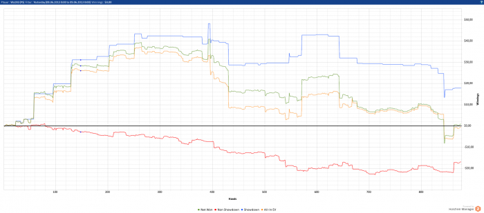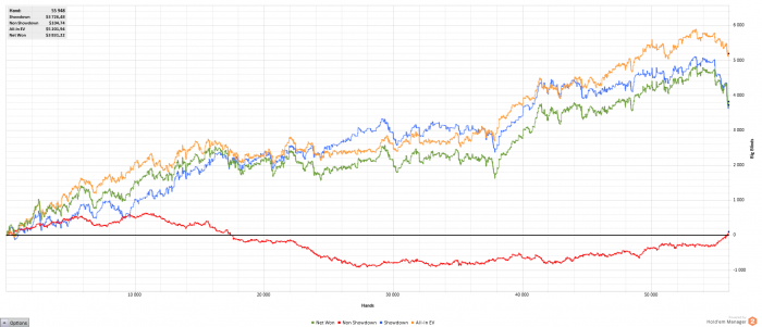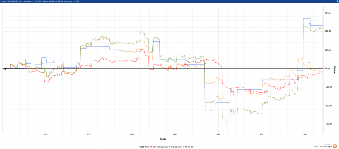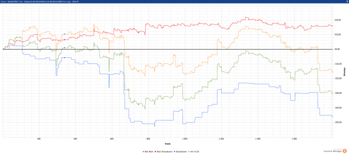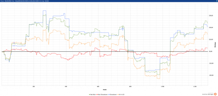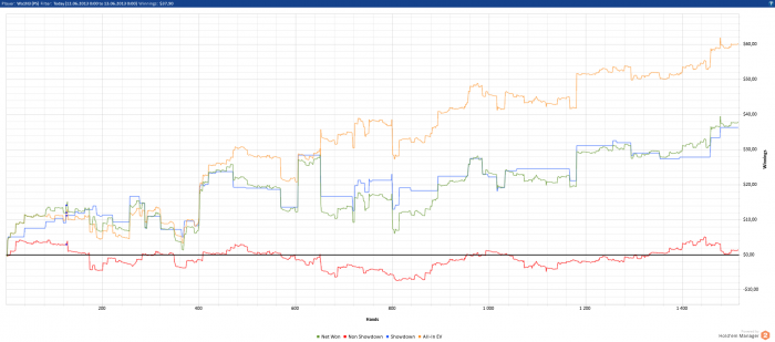 Мне даже как-то стыдно выкладывать свои графики сюда для отчётности. Как почитаю другие блоги, так вижу, что люди откатывают по 3к-5к рук в день. Для меня это просто не реально. Я не могу в день больше 2-3 сессий играть, т.к. потом уже устаю и могу поплыть. Каждая сессия не более 50мин, т.к. дальше уже могу начать где-то творить полную фигню. Кол-во столов - 6. Это примерно 400рук за сессию. Больше столов тоже не открываю, т.к. много думаю и стараюсь извлекать максимум велью из каждой раздачи. Пробовал 9 и 12 столов катать. На кнопки жать успеваю, но не успеваю подумать во всех раздачах, и из-за этого упускаю много велью, и много выкидываю, что бы было минимальное кол-во сложных решений. Возможно $/hr на 6 и 12 столах будут равны, но бб/100 явно будут не одинаковыми. Как по мне, то лучше бб/100, чем дистанция.