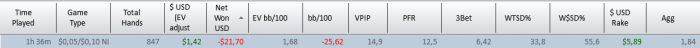 На момент выставления, почти всегда, у одного из игроков эквити >0% и выходит что если ты выиграл не имея 100% эквити, то тебе запишут перебор. А если проиграл - недобор. Выставляешься с АА вс КК и проигрываешь. Тебе запишут большой недобор, а если выиграешь - то небольшой перебор. Если на определенной дистанции ты чаще проигрываешь будучи фаворитом, то получишь недобор. Т.е. ты недобрал 5 стеков, постоянно выставлясь с хорошим эквити.