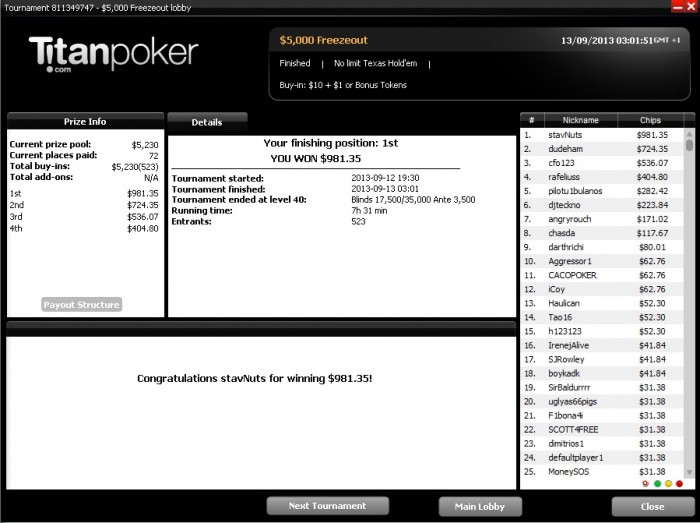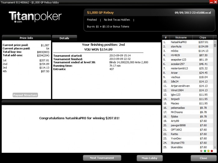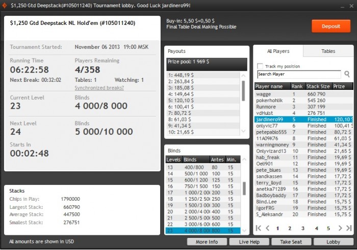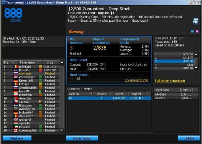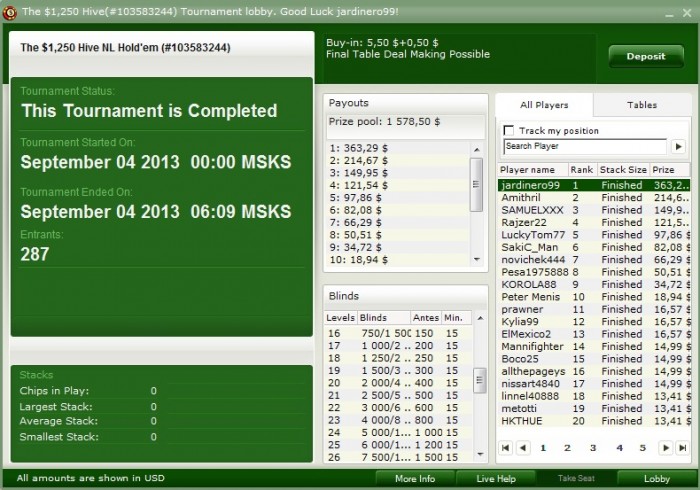 короче, играл я себе спокойненько 3-макс, шел 2-ым стэком, как ебучей конторе "билайн" захотелось отрубить инет нахуй на пол часа!!! а у меня ещё предфиналка на пати в The Hive!!! Вообщем, инет подъебал, на фтп занял 3-е, ща даже скрин не могу выложить, не могу найти этот турик! 3-е место +255$ нахуй в рот ебал!!! ща идет предфиналка на пати! иду 2/11