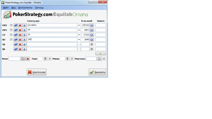 А теперь посчитаем кол-во комб, с которыми нас 100% будут колить. Всего в омахе 270к комб. Нас бьют: 22,44,JJ - по 6931 комбе на каждую из пар 24,4J,2J - по 17316 комб 345 - 2848 комб Т.к. не все игроки играют 100% рук, то сделаем отдельный рассчет на каждого игрока. МП - статов мало, но по имеющимся он рейзит 38% рук.В этот спектр руки 24,2J,4J явно не входят, поэтому остаются 22,44,JJ, 345. Получаем 23641 комб. Накинем сюда еще 15к, т.к. иногда 24,2J,4J у него все же иногда будут( 4JTQ, 2JTQ и им подобные). Получаем 38641. CO - рук нет, а значит по дефолту он тайтовый. У него в спектре будет только JJ и 354. И иногда 22,44 в двупарной руке. Получаем 9779 комб. Накинем с запасом 10к, если он вдруг иногда играет 22 и 44. Получаем 19779. ВВ - 4 руки, впип 50. Пусть это будет лузовый фиш, который колит 70% рук на бб(на микро таких хватает). У меньшив общее кол-во комб на 30%, получим его кол-во комб. 75589*0.7=52912 Теперь посчитаем, с какой вероятностью комбы, которые нас бьют, будут у каждого из игроков: МП - 38641/270000=14% СО - 19779/270000=8% ВВ - 52912/270000=20% Общая вероятность того, что как минимум 1 тело нас проколит, составляет примерно 40%. Думаю дальше спорить про фолдэквити нет смысла. Руки типа ФД и пара+ФД, я не включал в рассчет. т.к. против них у нас монетка и не факт, что с ними будут колить. Теперь поссчитаем наше общее ЕВ с учетом того, что мы сузили спектр колла оппам до тех рук, которые впереди нас. Эквити против диапазона колла у нас 23%. ЕВ в случае колла=(55.5+62.5)*0.23-55.5*0.77=27.14-42.74= -15.6 ЕВ от фолдэквити=62.5*0.6=37.5 Общее ЕВ=37.5-15.6=22бб Даже если мы увеличим кол-во комб у оппов. Например первому зададим такое же кол-во, как и третьему, то пуш все равно будет очень плюсов плюсов.