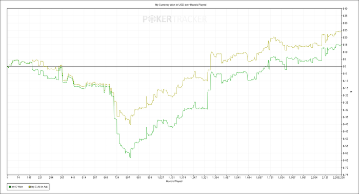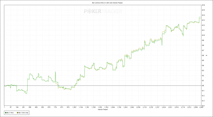 MP+2: $2.47 (VPIP: 8.33, PFR: 8.33, 3Bet Preflop: 0.00, Hands: 12)