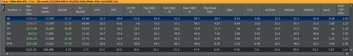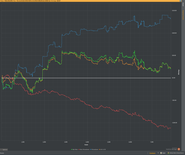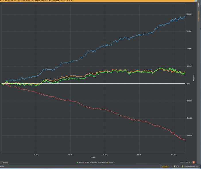 Ясно, что довольным быть нельзя после такого месяца, но определенные плюсы в отыгранном месяце есть. 1) Какая-никакая дисциплина присутствовала. У меня было полно месяцев с 20-30к, 100к - это неплохо. 2) Месяц в плюс! Даже не смотря на то, что это нл5 и выигрыш небольшой, плюс это всегда приятно.