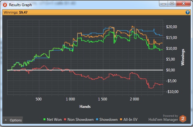 В какой-то момент как обычно думал что я не умею играть, пойду в МТТ, но потом обилие фишей не давало мне покоя)и понеслось 8 столов, селект практически не нужен, по прежнему иду с недобором в 5БИ, дела в целом так: 5к рук по ev/bb 9/100