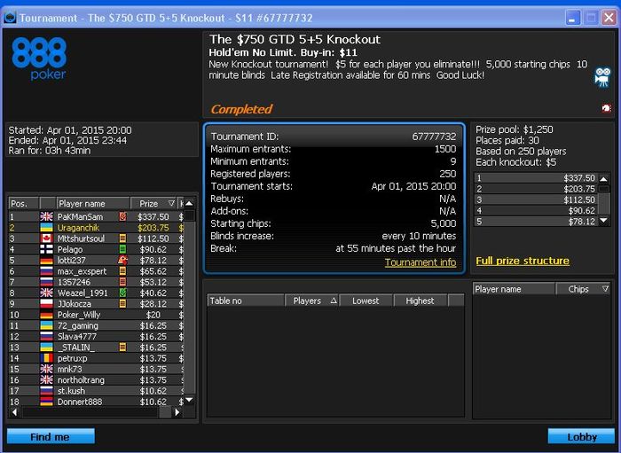 Pacific, $3.15 Buy-in (125/250 blinds, 30 ante) No Limit Hold'em Tournament, 9 Players Poker Tools Powered By Holdem Manager - The Ultimate Poker Software Suite.