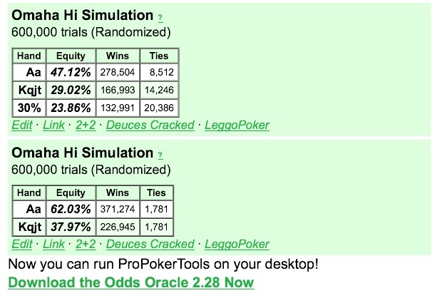 Куча впечатлений.... - тузы в позиции и тузы без позиции - двое разных тузов. Просто в шоке, насколько в омахе играет позиция... - есть товарищи, думающие, которые играют рейзом процентов 50%. Отовсюду. Чуть подтянуть игру и фишей не надо. - малые банки рулят. Не знаю какой тут нормальный выигрыш в бб/100, но маленькие банки помогают сильно. - никаких нафиг "он блефует колл". Просто никаких. - а еще появились товарищи, играющие целенаправленно против меня. Хочется передать им хорошую песню на радио.