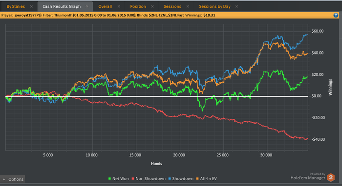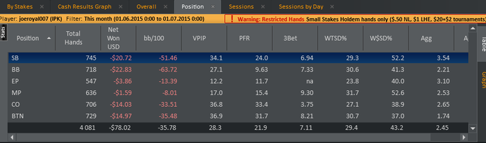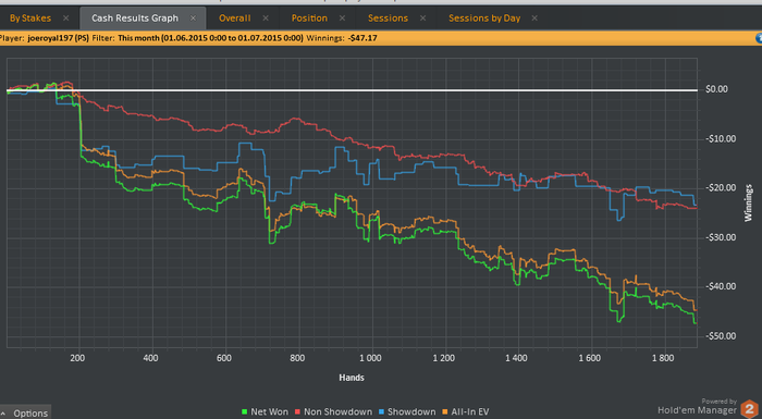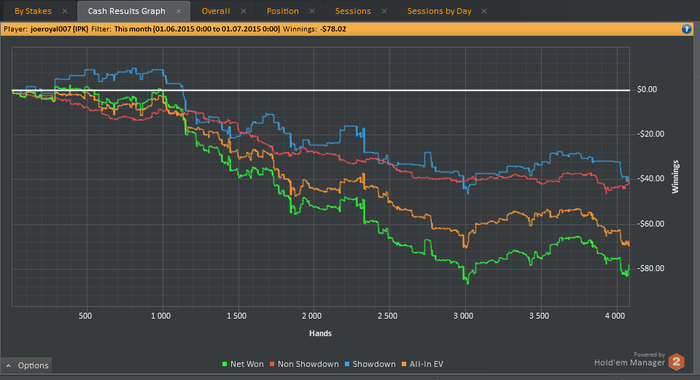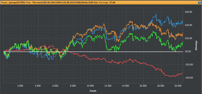 отыграл в июле 23 500 рук на покер старз nl 2 zoom.Получился первый плюсовый месяц за всё время игры.Хоть за последние 5000 рук ничего не выиграл чувствую огромное преимущество над полем.В августе попробую выиграть 100 баксов профитом где-то за 65000 рук