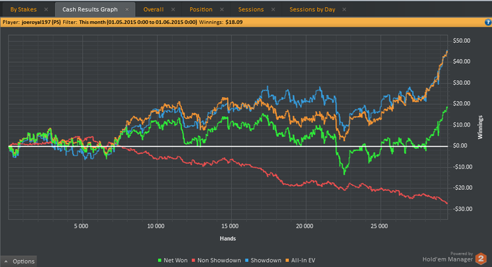Прошло пол месяца - отыграл 24000 рук выиграл 30 баксов.В игре дикие стрики выигрывая по 30 баксов за день и проигрывая по 20.Начинаю терять уверенность в игре - 10000 на нуле.