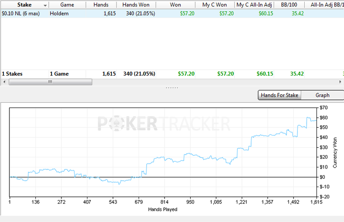 PokerStars - $0.05 NL FAST - Holdem - 9 playersHand converted by PokerTracker 4BTN: 142.2 BB (VPIP: 14.71, PFR: 11.76, 3Bet Preflop: 0.00, Hands: 34)