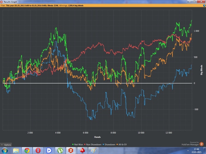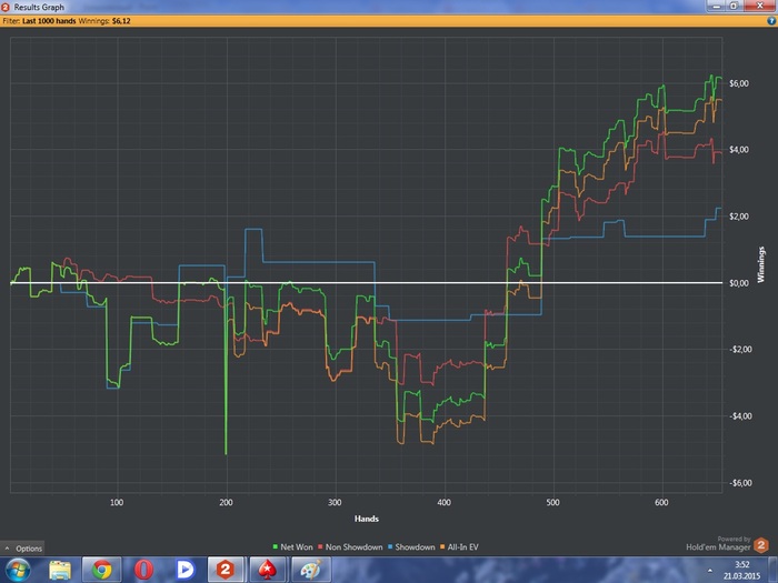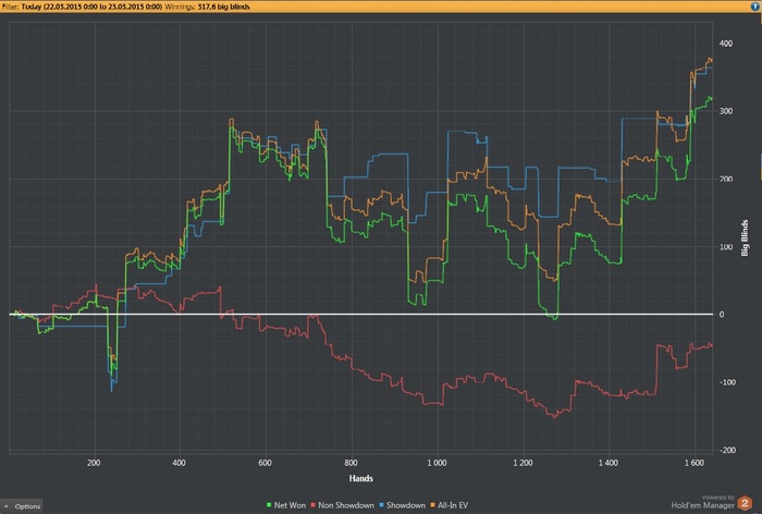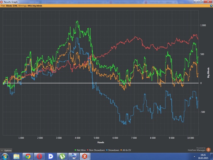 Красная выше ноля, на обоих графиках. Silence_ прав - это значит что я блефую. Но это не тупой блеф. Все это разумные стилы, рестилы, си-беты, флоаты, сквиз и 3бет лайт. Ну и опять же по графикам видно что с ХМ у меня получается гораздо лучше.