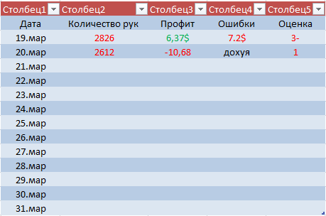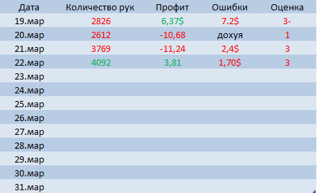 ну на графике у тебя не такой уж огромный недобор, а это значит что тебя не так часто переезжают как тебе кажется) твоя красная очень сильно куда то начала падать. я знаю что это такое когда за день куча доездов фишам и прочего, но такое не случается каждый день, иначе твоя линия ЕВ была бы на уровне 500$.. значит где то не добираешь, где то отдаешь больше чем нужно. и все это в куче получается твой минус. а можешь статы показать свои? да и вообще, столы хорошо селектишь? мне лично это дало 80%профита когда я понял что этим нужно заниматься, а понял я это не так уж и давно, месяца 3 назад)