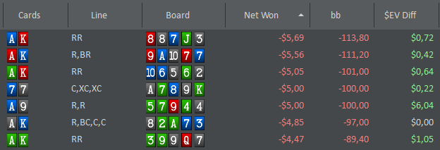 Результаты ниже: Hero had A, A Hero had one pair, Aces on the first board Hero had one pair, Aces on the second board UTG had K, K UTG had three of a kind, Kings on the first board and collected $5.70 UTG had three of a kind, Kings on the second board and collected $5.70 Результат: UTG выиграл $10.93