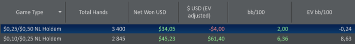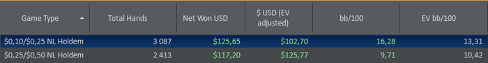 Неплохо подзалился и утратил уверенность. Сегодня сделаю выходной, а дальше как всегда оставлю только NL25, пока не почувствую уверенность в своих силах. Не знаю даже что еще писать, я расстроенный. А ну да, отыграл за месяц 25к рук -0.89 EV bb по всем лимитам, печально. Отдохну и продолжу, мб попробую катать меньше рук в день….