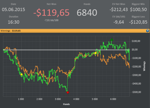 Отчет за 3-4 июня. Вчера ночью перекатал и начал страдать херней, можно сказать завалил всю сессию под утро. Особо не переживал и сегодня ночью показал очень хорошую игру, что позволило показать +ый результат. Единственное, под утро за одним столом на NL50, c замазочным фишом, заходило очень хреново и оставил там примерно 150bb, поэтому подкосило результат на NL 50. Пойду спать, а как проснусь, планирую устроить суперкатку до самого утра, примерно с 6ти до 6ти т.е. 12 часов.