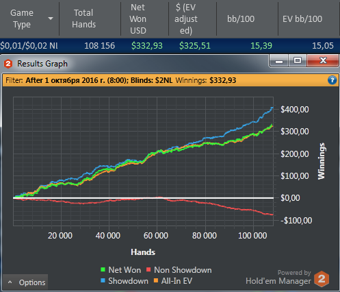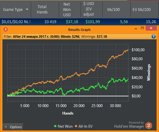 Перевалил за 100к рук с винрейтом 15/100 в конце начал лить по красной, скорее всего из-за того что мало борюсь за мелкие банки, возможно, потому что играю на работе и много отвлекаться приходится, но за счет апчика выехал)
