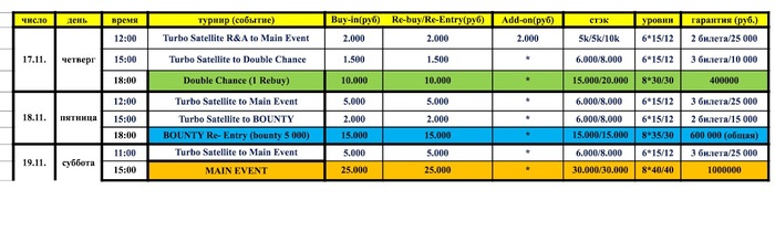 _ 3 основных турнира с внушительными призовыми фондами и кубками для победителей _ 3 сателлита к главному турниру серии Main Event по 25 000 руб., в которых мы разыграем как минимум 8 путёвок _ сателлиты к побочным турнирам _ ну и конечно же много, очень много, ну очень много cash game