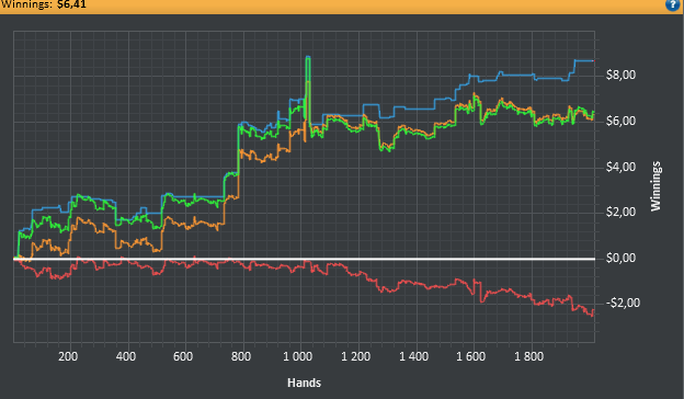Вот он,покерный дзен. Я постиг его. Ок,нл2-дзен,назовем так. Я думаю ,никогда еще такого графика не имел. 2,5 часа на трех и потом на четырех часах я просто парил над соперниками и над игрой. Спасибо флопзилле и некоторым советам форумчан! Есть конечно в бочке меда и небольшой тупизм с моей стороны,но прям все сразу наверное не постичь.Будем и над этим работать. Я про эту раздачу.