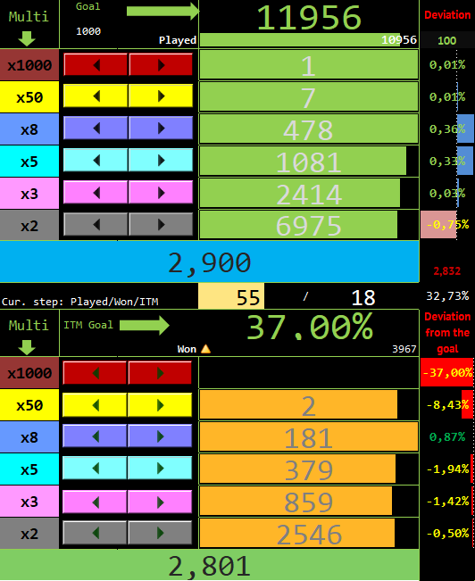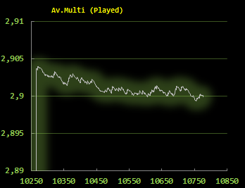На графике нет множителей х50 и х1000, т.к. это бессмысленно отображать их на этой дистанции. Но за эту дистанцию х50 выпало 2 штуки, что в общем-то тоже стандартно: примерно 1 на 2000 турниров.